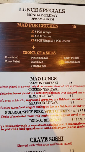 Come here when youre craving a crazy assortment of foods. If youre mad for chicken, you gotta get some of those double-fried wings. The drumsticks are meaty, crispy lollipops of flavor. Between the angry (spicy garlic) and the mad (soy garlic), I preferred being mad over angry. I cant imagine what the extra spicy furious would feel like. Too emotional for me. Coming with a larger group is recommended. That way you can round out your meal with a bunch of different Korean/Japanese/who-knows-where-this-came-from delights. We tried the truffle fries, Crave Is the New Black sushi roll (YUM Is the New Black, amirite?), kimchi pancake, sushi pancake, spicy crab avocado salad, and the okonomiyaki. They also offer a variety of dranks including a communal cocktail involving fire. Another reason to drag all of your friends here. Unless youre also craving drunkenness and want to attempt it on your own. All in all, Crave Mad For Chicken will satisfy.