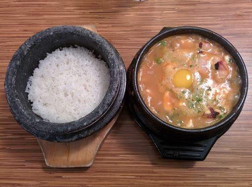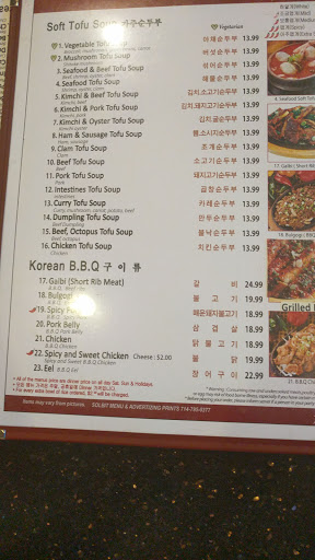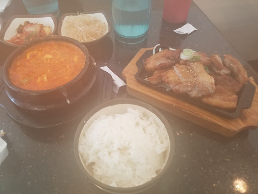 This is a very small location. Write your name on the clip board, and wait outside because it usually gets pretty crowded inside that small restaurant. If youre new to Korean, you should definitely try the combo of tofu soup with either BBQ beef or ribs. These Korean BBQ dishes are marinated with great flavors, and appeals to many different types of palettes. The combo-sized tofu soup is smaller when you order the combo, but its worth it because they give you a lot of meat. My favorite tofu soup (soondooboo) is the seafood and kimchi/beef if I dont get the combo. They also give you banchan (side dishes) complimentary before your meal arrives, and I personally really like the cucumber kimchi and the potato salad. This place is great for a cold day in Boston!