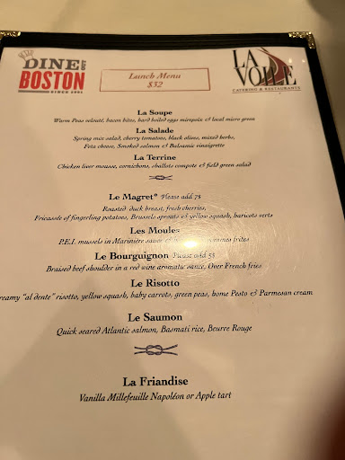 I almost dont want to review this place so it stays my little secret.. but they deserve the business because theyre a fantastic establishment. La Voile feels like youve been transplanted to Paris. The chairs, tables, bar, waitstaff, bartender and chefs are all from France and it makes it even more quaint. We went with my in laws who raved that it was better than some of the places they ate at in Paris! The food is outstanding and the service as well. Well worth the money. The rotating prix fixe menus are a great value. They also have the best macaroons I have had in Boston. I am seriously considering asking if I can just buy some of them to go. Get a table for your next celebration dinner!