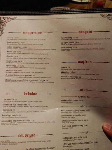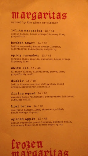 Lolita Cocina is the type of place I absolutely WANT to love, but find myself looking for things that arent there. The ambiance was lovely, I felt like I stepped into a Film Noir being played on Telemundo-- gorgeous brick walls, dark-but-not-too-dark lighting, and red red red galore. My companion and I were seated in a nice corner that was lit enough to see and enjoy our food, though I could see other areas with lesser lighting that might prove annoying. Service is where I was disappointed. I understand that I appear a lot younger than I am / perhaps not their usual Newburyesque clientel, but even if I were a springier chicken, I should be treated with respect. Our server paid most of her attention at other tables around us, and stopped by only briefly to check on us after we had flagged her down. At one point I had to ask for side plates as we had been presented with our food but no solo plates on which to eat things. I had asked a few questions about the differences in tequilas and was met more with shrugs and "Well that one costs X and this one costs Y" rather than the explanations I had sought. Again, I hate to blame appearance, but it definitely seemed the case, as I can think of no other reason we were so overlooked. I emphasize that our manner of dress was in standing with the restaurant, and if anything, was "dressier" than many around us. The negative aspects aside, I had a wonderful time in spite of it. The food was delightful, and the guacamole especial is a must order. Jumbo lump crap and lobster overflow from on top of expertly prepared guac-- the addition of a garlic butter drizzle truly just adds to the decadence. We shared the grilled corn (amazing!), the sticky spare ribs (pretty good but very fatty) and the duck confit tacos (some of the best tacos I have ever had). Drinks were well made but a little one note for me. The margaritas were the best of the bunch, as one would expect from a tequila oriented bar. My favorite was the spicy cucumber, as it was not overly saccharine for me. The broken heart just proved too sweet for my tastes, but the standard fruit and booze lover would enjoy it. Im a gin gal. Who asked me to review margaritas!? As for dessert, well, while everything looked amazing it is truly unnecessary. With your check you are delivered AN ENTIRE GREEN APPLE COTTON CANDY COVERED IN POP ROCKS. I melted half of it into my water glass. I have a neon green tongue and no regrets. Anyway, overall Id absolutely return, though Id hope for more attentive service.