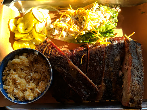 This place needs a lot of work. Service is really really bad. There seems to be something fundamentally wrong with the way they cook the food here. If you are familiar with a real BBQ place you will taste it immediately. I had ribs and brisket here. The brisket tasted like salty chemical smoke. Ribs were off tasting and just not done right super tough. How do you make ribs tough? Im a fan of dry BBQ but if youre going to go that route than make sure you can do it well. If you want to go sauce then do something better than the ketchup, hot sauce, and bottled vinegar that they say are house made bbq sauces. Absurd. If this is house made then you need to use someone elses house. Everything is ridiculously overpriced from platters to drinks. The reason it gets 2 stars is for the cocktails. Actually done very well. Point is if you like BBQ i would stay away because this place will make you sad. I guess if youre looking for BBQ in new england though you should not have high expectations.