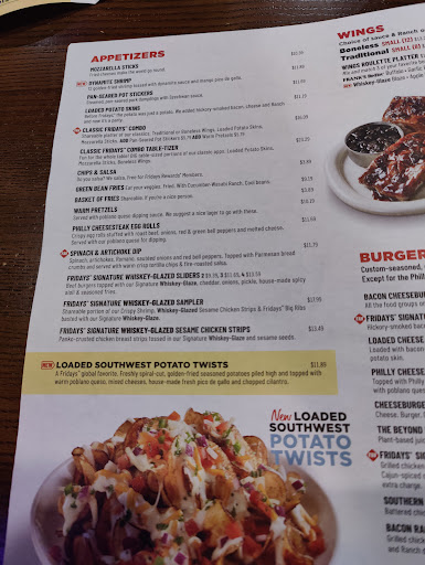 This place is horrible!!! Closest Fridays to me so I go there. My last two experiences were the worst I have ever experienced out to eat. Last time I went there for my daughters birthday (she love hearing the waiters sing) so I thought she would like it!! I asked the waiter for the birthday song he said he has choice to do n he doesnt like to sing!! So he would js give her the free ice cream. I asked if he can get co workers to sing he said no. So I left him exactly 0% tip. Not the first time, the food is ok nothing special but their staff is unprofessional and careless.