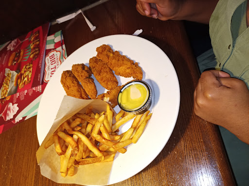 This place is a complete dump. We entered the bar area on a Monday night and five of six tables were empty and dirty, as in: dirty dishes, not cleaned up at all. Had to sit at the bar, because no clean table available. Bar was smeared dirty and sticky. The entire place looks grimy and the mens bathroom was disgusting, dirt in the corner, TP and paper towel scraps all over the place. Worst of all, I got violently sick from food poisoning that night (beer, chicken strips and fries, nothing exotic!!) and this was the only food I had since a home-made sandwich lunch. I recommend to stay away from this place and let it shut down. Only better can come out of that.