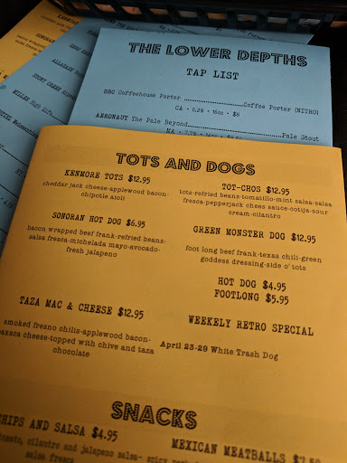 Hankerin for a fried, deconstructed loaded baked potato? Kenmore tots got you covered. Cheddar, bacon, scallions, chipotle aioli blanketing warm, crunchy potato pillows. Youre welcome. My pet peeve is when you order nachos and all the good stuff only covers the top third of the chips. Who wants to eat naked chips? Not me. I guess nudity peeves the guys at TLD too, since their tots are perfectly laid out on the hot plate, ensuring cheese and meat and spice cover every starchy inch and therefore make an appearance in every bite. Thank you. As for drinks, the extent of their bottled offerings is impressive. And darn overwhelming. Fortunately the menu is separated out by beer type (IPA, wheat, lager, amber, etc.) so you can slowly focus in from there. Once I selected a general category (which still took considerable effort), I asked the waiter for his recommendation based on what I was looking for (the less hoppy the better!). He was super knowledgable and let me know that West Coast breweries love their hops, so I would probably be better off picking one from another region. Well there we go. Learn something new every day! I went with his rec, and it was on point. Waiter dude knows whats up. Although I found the food and drinks to be above par pub fare, the atmosphere left something to be desired. Namely darkness. "The Lower Depths" incites a a cavernous, mysterious image which clashes with the overly bright, loud reality of the space. Dim the lights, get a credit card machine (Cash only? Are we in the 1980s?), and all will be right with the world. Or at least with this beer and tot-toting bar.