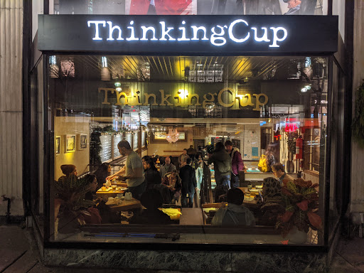 After dinner in Back Bay, I stopped into Thinking Cup, a decent sized coffeehouse on Newbury Street in Back Bay. The menu is written on wood framed chalkboard. The menu consists of hot and cold beverages, grilled cheese, and sandwiches. In addition to the menu items, they sell pastries, baked goods, chia power pudding, and bottled beverages (e.g., sodas). Its a neat place to study and/or work. The cafe is decorated with musical instruments (e.g., saxophone, trumpet, and violin) and vintage table with newspaper prints below the glass. I ordered a White Chocolate Matcha Cake and a Chai Latte. The White Chocolate Matcha Cake is best described as a marbled pound cake consisting of swirls of citrus infused white chocolate cake and matcha cake. I liked how the top of the chai latte was foamy and frothy. I got a tiramisu, fruit tart, and pistachio macaron to go to enjoy for the rest of the week. Id recommend both the tiramisu and fruit tart as they were moist and fresh. I was disappointed I couldnt taste pistachio in the pistachio macaron.