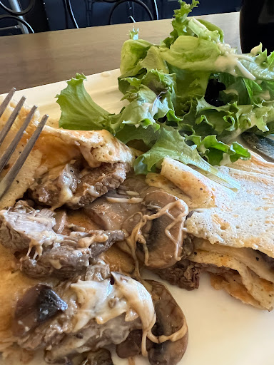 Today was the first time Ive been to the creperie. Walk up counter order what you like, have some good fair trade organic coffee or choose from a list of smoothies, sit if you can find a seat or walk off with your crepe in hand and enjoy. I had the western omelet today ($5.95). More egg would have been better but it was good. I can see why people dont like the seating arrangements but guess what, they knew there would not be great seating if they did some research. Ill be back.