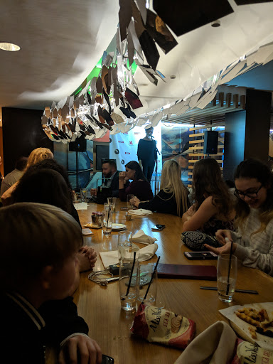 Great atmosphere. Sophisticated but unpretentious. Food was average as well as the service. Not inexpensive. That being said, we enjoyed our visit while staying at the hotel as we watched college football and played a board game with our two teenage children. I will say the breakfast Buffett was outstanding with a made to order omelette bar. Very good food and good atmosphere again.