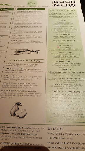 Delicious meal, organic, healthy, decadent, and friendly service. I suggest visiting here during Boston Restaurant Week. We had appetizer: Blackened Steak & Blue Cheese flatbread cremini mushrooms, spinach, caramelized onions, main: Grilled Boneless Rainbow Trout crushed potatoes, roasted carrots, grilled lemon, Sesame Grilled Salmon Salad organic greens, pineapple, mango, jicama, lemongrass sauce, toasted sesame dressing, and for desserts: Rasberry Chocolate Chip Cannoli Mini chocolate chips, sweetened ricotta, mascarpone cheeses, raspberry sauce, cinnamon cannoli shell, Mocha Macchiato Mini mocha mousse, vanilla mousse, chocolate cake, caramel sauce, whipped cream.