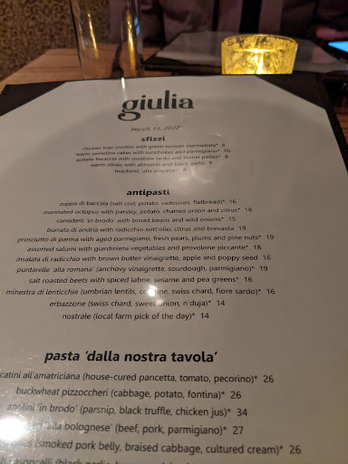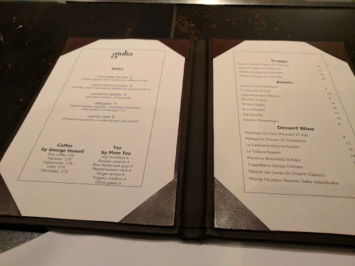 My wife and I enjoyed our dinner at Giulia. Our server was both personable and knowledgeable. When unsure of which wine to have with dinner, she brought us samples of each to try - a nice touch. Giulias menu has a wide variety of choices and offers many dishes not typically found in Italian restaurants. From hearty pasta dishes to delicate seafood preparations - once you read the menu youll already be planning your next visit because youve spotted quite of few entrees that sound wonderful. We shall return !