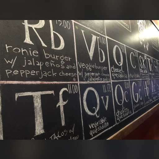 Decent bar food. We enjoyed the fish tacos especially. Theres not much of a science theme except for the name and menu on the wall; the food is burgers and American-style Mexican food. There are no printed menus, and the wall is hard to read. Unfortunately, its not the best Mexican food on the block.