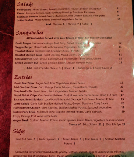 Ive been to the Druid many times and like it a lot, but on my most recent visit, pretty much everything went wrong. We seated ourselves at a table in the fairly empty pub at dinner time on a Thursday evening, and waited around ten minutes for anyone to come by. The Druid is supposed to have the best Guinness pour in the city, but I guess it doesnt carry over to other beer, as my Sculpin was 1/3 foam. When the burger I ordered medium came out pretty much raw, I decided Ill take a break from the Druid for a while.