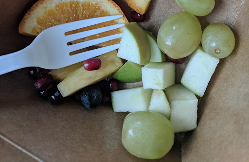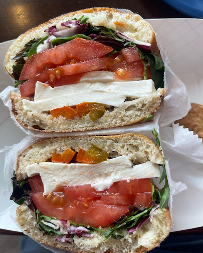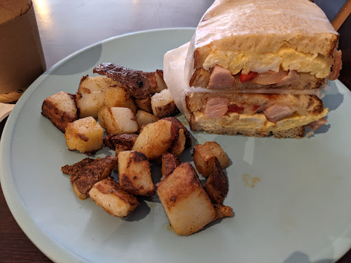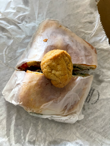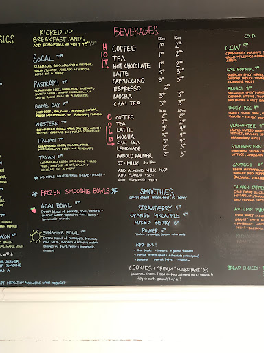 I love the food here!! The lunch sandwiches are better than any Ive had at a chain (including Panera). My favorites are the Vermonter (maple honey turkey, cheddar cheese, granny smith apple & cranberry aioli) and the Brusci (cracked pepper turkey, jalapeno cheddar cheese, roasted red peppers, lettuce, tomato, spicy brown mustard). But I dont think you can go wrong with any of them. Breakfast is a treat! Today, I sampled their special: a cheese biscuit covered with sausage gravy and two eggs. It was the best biscuit with gravy Ive ever had. The hash browns were perfectly seasoned too. Last but not least, I love their buttercream-iced cookies. They usually have these around holidays. Mouthwateringly delicious!