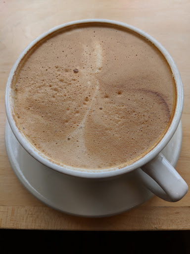 This is a rustic not chic coffee shop that is really like the back of a bakery they do have an excellent variety of pastries and breads but the coffee shop itself is dark and nearly dreary because of the dense trees outside. You must go to it passt a gas station and parking lot into an old manufacturing building. Nevertheless I had a great pastry and coffee today.