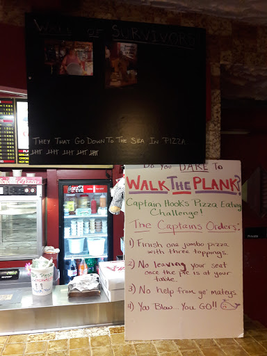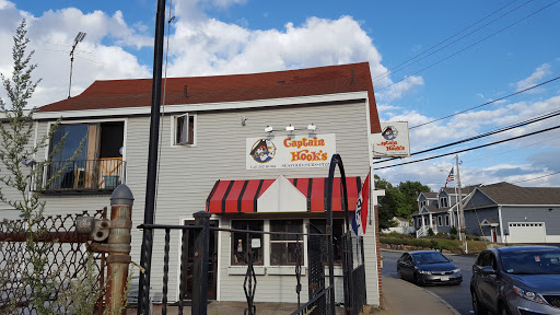 I eat here a couple of times a week. Their subs are good and you can get half-size subs which is usually enough unless you are very hungry. Their pizza is thick crust--I think Sicilian style. It is a small operation so they can get swamped when it gets busy. Capt. Hooks has a nice patio right on the river. Nice family run place.