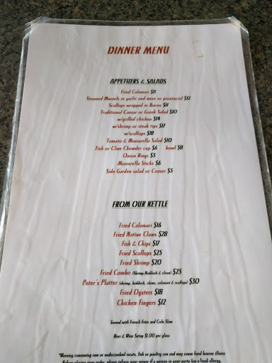 Fantastic food! Best clam chowder Ive ever had. Better than the chowder at the Wind & Sea in Boston, which was a heck of a lot pricier. Had the bowl (not cup) which was a meal in itself, and was fantastic. Not understanding that the portion was large my friend and I ordered that, well he got the Fish Chowder, since he cannot have gluten at all. Hes got Celiacs so gluten is literally poisonous to him. They completely understood and had their menu ready for it. Which is uncommon and AWESOME. So anyway, we both get the chowder and a bowl of clams. Expecting a smallish bowl of both. Mistake. The clams were huge! And very good, littlenecks from probably about 500 yards away. Butter and clam juice as you want for it. Anyway, while this was a big mistake, we manfully tried to finish our plates. We were so full... I finished the clams, barely. Could not finish the chowder. Which was a shame. My friend finished the fish chowder, couldnt finish the clams. Lunch was 25 each... but thats because we basically double ordered two main dishes. And we rolled out the door. Barely fit through the door really. We didnt eat dinner. We barely ate breakfast the next day. And it wasnt a late lunch! They also had 2 lobsters for 25 at the time on the menu... wanted to come back a few days later but just never had time on that trip again. The place was truly full of people as well. Its "where the locals eat" and we were recommended to go there as well. Next time Im in Gloucester you know where Ill be eating.