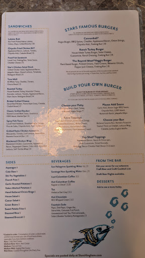 Stars has a very large and interesting beer selection on tap as well as a delicious blackened bison burger and buffalo chicken rangoons that you cant skip. Friendly staff good place to sit and chill and watch a game as well plus they have music on the weekends which is pretty fun.