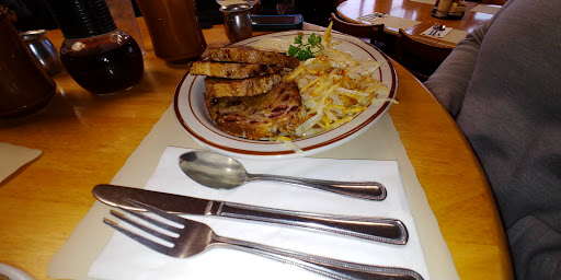 Three out of four slices of toast were tasty, one burnt. The rest of breakfast was poorly cooked eggs and hashbrowns from a bag. I may be picky about coffee, but this was some of the worst coffee Ive tasted in a long time. The waitress mumbled an unpleasant warning at me when I sat down, was unfriendly and brusque the entire time, and demanding when I paid. All in all, a very upsetting breakfast. I was surprised it seems so popular.