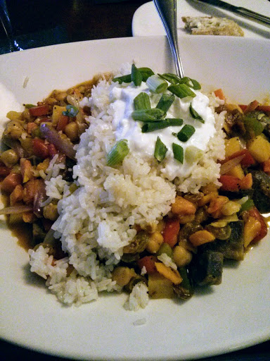 The Moroccan stew is wonderful. Its a little pricey (for me), as are most of the entrees, but big enough to split with someone else. I also tasted the calamari. After having wonderful calamari on a trip to S. Africa, I had given up on finding any that was edible in this country, but this was just as I remembered it.