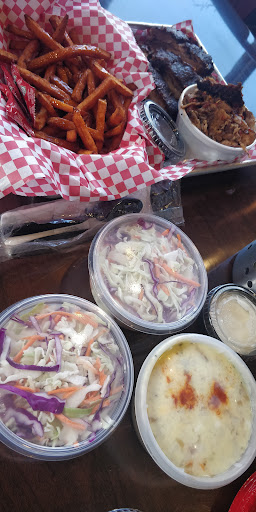 I dont know how much the owner paid people to leave good reviews, but it wasnt enough. Ive been into real bbq for many years. I smoke meat on my Big Green Egg. Ive visited and eaten in Austin, Memphis and other places famous for their bbq. The pulled pork sandwich I ate here today was nearly tasteless. Tender, yes. But devoid of any wood, smoke or other flavors you expect in authentic bbq. I even asked if they smoked their meat using wood. I was assured they did. Of the three sauces presented, not one was strong or even spicy, including what looked like the classic North Carolina vinegar and crushed red pepper sauce. How do you make that one without any zip or heat? The potato salad side was even more bland. And the cornbread was too sweet and sticky. Perhaps the brisket or ribs are better. Ill never know because Im never spending my hard-earned cash there again. You want good bbq? Buy any jar if bbq sauce at Shaws and slather it on your food. Whatever it tastes like will be better than what they serve here.