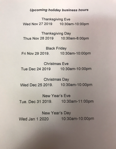 | Working: | 11AM–10:30PM 11AM–10:30PM 11AM–10:30PM 11AM–10:30PM 11AM–11:30PM 11AM–11:30PM 11:30AM–10:30PM |