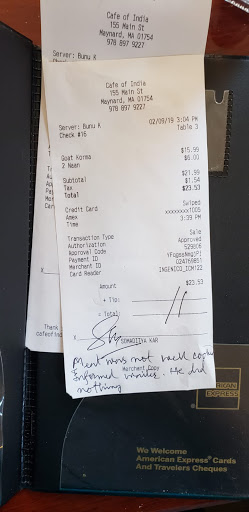 Great Goat Curry, very nice atmosphere , great service and a real treat if you want the best Indian food in the Acton, Concord and Maynard area !