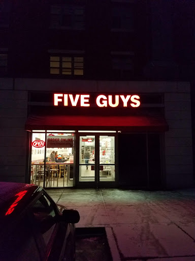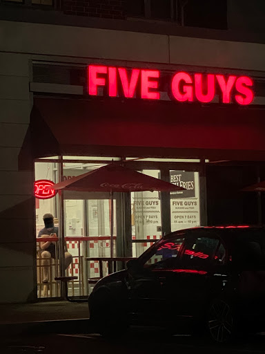 Standard Five Guys food and gets very busy during lunch/dinner. Parking can be difficult if you dont get lucky with a spot on the street (there is a relatively close parking garage though).