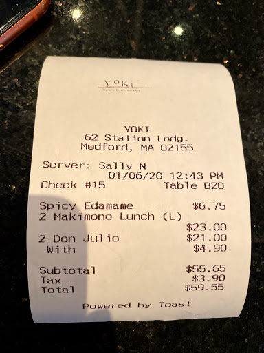 Yoki is a fantastic sushi place. You can eat at the bar or in house, either way its always a fun experience. they have plenty of choices even for non-sushi eaters in your group. We loved going there and can eat for under $50.00 while being completely stuffed! Its worth the trip in and the service is quick and always with a smile!!! Now that we are moving we commented, "where will we get our sushi!?" Its fun for a group or date night, and they often participate with groupon which again allows you to get a lot of food for a little price! liz, medford
