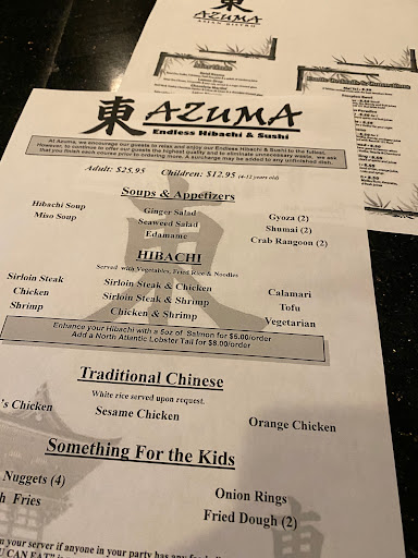We used to go to Azuma almost weekly, back when the menu included Chinese, Japanese, and Malaysian dishes. We stopped going while back when they (presumably under new management) got rid of the sushi. Recently, they started serving sushi again (indeed, their menu implies theres not much else besides the hibachi tables). So we wanted to check it out. There was no one at the front entrance to seat us when we entered (around 8pm on a Thursday night). There were two hibachi tables in use, and 4-5 people at the bar. There was no one in the dining section. There were 4 waitstaff, a sushi chef, and a bartender within sight of us, all of whom we were able to make brief eye contact with, and none of whom, over the following ten minutes (thats an objective 10 minutes by the clock, which seems a much longer time waiting with a toddler in tow), lifted a finger to seat us, greet us, apologize and let us know that someone would help us in a moment, or even acknowledge our existence. These people were not busy; a few of them were casually cleaning things or serving a drink, but mostly they were chatting with each other and the customers at the bar. My wife finally went over to the counter and asked whether we should seat ourselves. She was answered with no apology from anyone, questions from one of the waitstaff about whether we were with a party ("no, were here to eat dinner") and no answer, and, eventually, a brusque response from the bartender that hed be with us "in a few." As it turns out, he wasnt, because after a couple of minutes more, we left, depriving Azuma of a $40+ and us of a meal of unknown quality and terrible, terrible service. I wish theyd change their name so that I dont associate the bad restaurant of today with the truly superlative restaurant of a couple of years ago.
