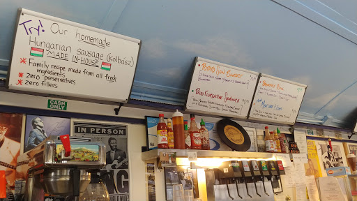 An AMAZINGLY cool place to eat but do get there early as there is only a counter with about 12 stools which are very close together. The joint is decorated with awesome vintage rock and blues memoribilia and there is a continuous flow of great music playing in the background. The two ladies working the tight place were friendly, efficient and fast. Our food was good, really good and the Hungarian sausage was delicious and tasty..not spicy but as good as Italian linguica. Since I had never tasted it before, the owner was kind enough to bring me a couple of little pieces. Our food came quickly and many of the customers were regulars and called by name. Bitchen place with a great vibe. A+++