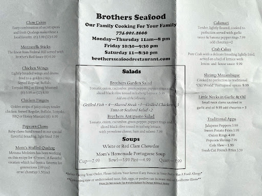 Brothers Seafood is a smallish family restaurant and bar in an innocuous strip mall in SeeKonk Massachusetts. Dont let that fool you! We had the stuffed Quahogs with Chorizo made from "moms" recipe. Fabulous, and huge! I had the whole belly fried clams that were the best Ive ever had, and by living in New England all my life, as well as working as an offshore fisherman on Cape Cod for 1 1/2 years, Ive eaten a lot! Very light, but crispy batter, and fresh, sweet clams. My wife had the Portuguese soup, and raved about it. The woman working the floor was very personable and helpful, especially that we brought a 2 year old with us. She immediately got her some crayons and a coloring book, as well as a booster seat. Overall, I would recommend this fabulous place to anyone looking for some great seafood with a friendly atmosphere!