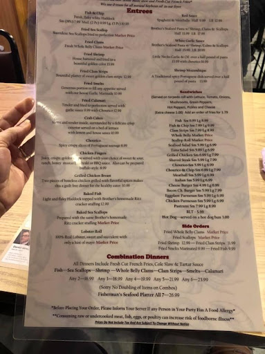 In visiting a friend, I flew into the Providence airport. While waiting to be picked up by my friend, I looked up several seafood places in the area (Im from Ohio so good seafood places are few and far between). I stumbled onto Brothers and thought it sounded like a good place to eat. It completely exceeded our expectations. It reminds me of a local hangout/Italian eatery than a seafood restaurant; it has a very relaxed atmosphere and the owners are very friendly. My friend and I each ordered a 2-choice combo platter (clams, calamari, scallops, and shrimp) and tried everything. The clams were truly melt-in-your-mouth delicious, the calamari was very tender and sweet, the shrimp was succulent, and the scallops were seasoned perfectly. The portions were HUGE, which was good because we were both hungry, but even then we didnt finish everything. This is now our "go to" spot for when I visit my friend: well definitely visit again and highly recommend trying this neighborhood gem.