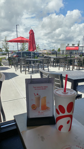 Went for the first time today at lunch time (about 12:30). Drive-thru line was insane so I went inside. Line moved quickly. Counter staff is very pleasant. Ordered a meal, asked for my drink with no ice and it was handed to me full of ice. (They get your drinks for you here, no self-service soda machine.) They take your name and call it out when your meal is ready, and the place was so busy and bustling that when mine was called I just got it and left without checking the bag. About halfway home I reached in for a fry... Nope. They forgot the fries. Oy. Went back, told a nice young man who was handing out orders and he quickly got an order of fries for me and apologized for the inconvenience. Luckily did not ask for a receipt because no one ever gave me one. As for the food, meh. I got the deluxe chicken sandwich, which comes with lettuce, tomato, pickles and your choice of cheese (American, pepper jack or colby jack). I do like the option there and its the only fast-food place Ive ever seen that has that option. While the sandwich is good, its nothing special or spectacular. The fries are good but again, dont really taste any different to me than fries from anywhere else. And since I was in during the lunch rush (I strongly advise against that if at all possible - parking is difficult) I assumed the fries are constantly being cooked but the ones I was given seemed not so fresh and a bit soggy. Which was weird. Will I go back? Probably at some point, but only if Im in the area. Likely wouldnt make another trip there just for Chick-fil-A.