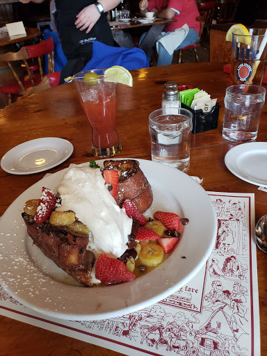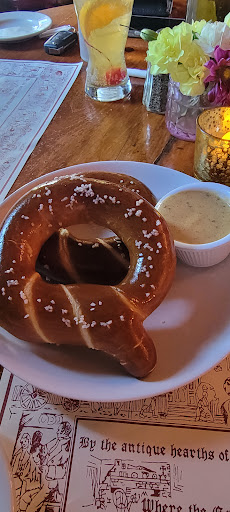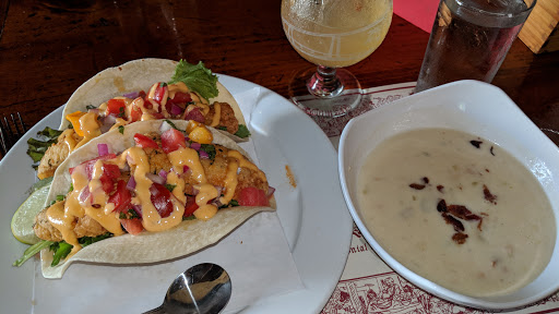 Delicious and unique dishes. In the past weve gotten chilli pizza and a smores inspired cake with marshmallow whipped cream. So good and hard to explain. It was a completely unexpected dish and the deserts change once every 2 weeks (I think). Photis below is the lobster bisque with a decent amount of lobster meat with a rich creamy soup and a fried crab meat burger. Incredibly messy, but also delicious. Music is often playing in tbe restaurant as well as shows in another room. The theme of the restaurant is revolutionary war. Extra parking is across a covered bridge with white christmas lights.