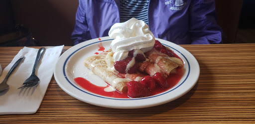 My mom and I went today, looking forward to a delicious blueberry Danish crepe that we totally loved in an ihop in Bloomfield, Ct. We had never been the this Shrewsbury place and never will return! My mother didnt want to sit where it was crowded, the space was too small in one end of the restaurant so we were seated where there were a few booths. Looked like where the help took breaks. The carpet was strewn with rubbish. I went to the bathroom to wash my hands and it smelled like someone had sprayed chemicals all over, and it wasnt clean. We couldnt find our favorite pancake dish, so Mom ordered Lingonberry crepes, and I ordered what I was hoping to be a bit more healthy meal of fresh fruit on (or in, I was hoping) a rolled crepe. Now in the house of pancakes youd think that the chef would know what the heck a crepe IS! Have you ever seen a crepe folded like a napkin or a wad of papertowel? It had the consistency of rubber. It was supposed to be rolled, and only two on the plate, instead it looked like a pancake trying to be a tortilla or something else. Moms were cooked at least. The "healthy" version I ordered didnt even come on a plate, it came in a soup bowl! The "fresh fruit" consisted on a few slices of banana, one piece of pineapple that didnt taste right, and was sprinkled with granola which had the consistency of sawdust. I asked for the "yogurt" on the side, which was not really yogurt: it was some kind of sugary, artificially colored crap that didnt resemble yogurt at all. I returned the "healthy" dish, and ordered the same as Moms, which didnt look as good as hers at all even. It came with a different topping, and most of it was barely cooked, Yich. Finally the nice waitress realized the dish we had hoped for and surprised us by bringing it. Of course it was too late and it still wasnt cooked properly. That cook just didnt know what the heck a crepe was, and had no finese or class at all. Ick. Ihop and that dish we liked will be one less desire in my ideas of what to eat for a treat.