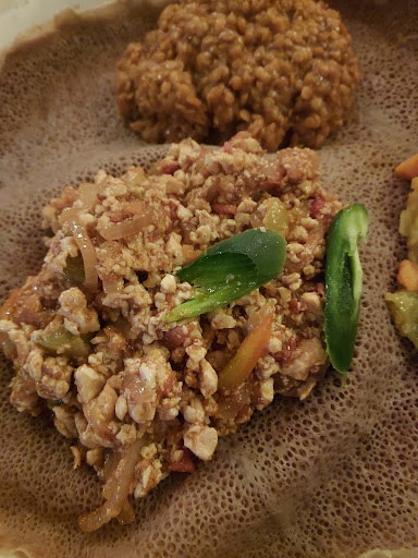 I entered the restaurant and noted an Ethiopian family enjoying their dinner. I asked how the food was and was told I would find it very good indeed. It was very good indeed ... actually excellent, and among the best Ethiopian food I have had in four large cities. We began with Ayeb Bé-Gomen, homemade cottage cheese mixed with fine chopped collared greens,herbs and spices. Eaten with injera, this was an excellent start, not too heavy and very tasty. When it came to the main dishes we presented our server with something of a challenge. My daughter is a vegetarian, my wife allergic to beef, and I am a born-again carnivore. We settled on the Fasika Combo (For Two) with a choice of any four Vegetables and three Non-Vegetarian dishes. I had kitfo, an Ethiopian take on beef tartar seasoned with mitmita (a very hot blend of spices) and (at my request) mixed with some chopped raw onion. My wife ordered Yé-Beg Wot, lamb cubes stewed with onions,Jalapeno peppers and other spices, and my daughter made up the remainder out of vegetable dishes. I tried the lamb and found it to be slow cooked, and wonderfully seasoned. The vegetables were also very tasty, especially the split lentils cooked in a berbere sauce (another traditional spicy pepper combination). The service deserves special mention. Given our particularities, my raw beef arrived in a separate bowl placed nowhere near my wife while her lamb was on the main platter but over a plate hidden under the injera so that it was contained. By the way, that dinner for two was plenty for the three of us and then some. After receiving the bill, I rechecked it as my wife had had wine and I beer, and the total seemed too little! I went over to the Ethiopian family and expressed my pleasure at the food and service, only to discover that I was addressing Befekadu Defar, the manager/owner. I have eaten at three other Ethiopian Restaurants in the Boston area and this one is quite simply the best. It also beats restaurants in Chicago and San Francisco and ties with one in Washington, DC. When (not if) you go, do sit at the traditional tables and chairs. You will understand when you see them.