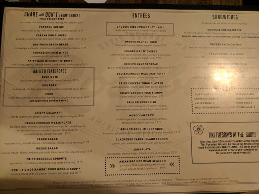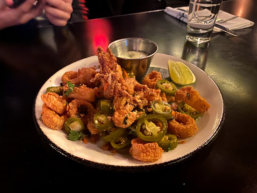 About an hour for dinner for 2 without feeling rushed. We were seated for our reservation upon arrival. Our server came almost immediately to greet us and fill our water glasses. He came back to get our drink and cocktail order. We tried the calamari. The breading was crunchy but we thought the rings were chewy. My cocktail, la casa de azul, was good but not blue as I expected. I had the chicken fried catfish sandwich and my date had the fried chicken thighs. The sandwich was great. The bun was soft and even though I hate shredded lettuce, it provided a great texture but didnt keep my bun from getting soggy as I ate. The bbq bacon should be its own meal or at least appetizer! The fries were hot and crunchy on the outside and meaty on the inside. The chicken thigh entree comes with 3 thighs mashed potatoes and slaw. The thighs were good sized but we thought it couldve been seasoned better. The potatoes were good. The slaw was not good at all. The server was present but not intrusive. The requested condiments were brought before the meal hit the table. The appetizer plates were removed immediately prior to the entrees being served. My only complaint is the hostess who kept leaning into the "train area" to see whos almost finished or whatever. She leaned right behind my date about 4 times. It annoyed me considering she couldve just walked into the area and saw everything.