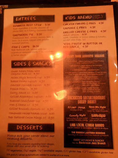 Ive loved coming here for a long time because of the down-to-earth friendly nature of the place, and how accessible the musicians are, and how wonderful the choice of folk musicians that choose to gather here. I finally write today because a month ago, my wife and I, expecting, came in and commented to ourselves that, well, itll be a while before were back. Not so! Our one-month-old was warmly welcomed and was highly entertained tonight by the music of the Bag Boys, and we had a similarly good time bringing my mom and her new grandson here a week ago, too. The food, its pub food, but pretty good for that. Weve stuck to Smithwicks for beer. She orders the half, has a sip or two if the kids not due to eat soon, and then I finish it. You really dont have to drink to have a good time here, either. Its a fun (if loud!) place to sit and catch up with a friend or two, too. Basically, I wanted to express my appreciation for this wonderful neighborhood pub that has the feel of a multigenerational, warm, friendly Public House, and not so much that of your average sports bar. Oh, and the holiday decorations were pretty thick and lovely. So thanks for being awesome, Burren!