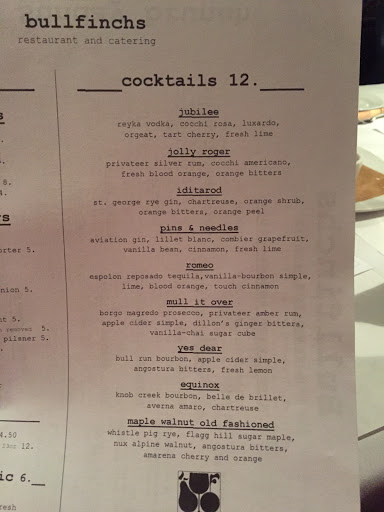 Fabulous place for adults. My wife and I go to Bullfinchs regularly because we love the food and the feel of this place equally. The interior is dimly lit, cozy and inviting. My favorite is to sit at the bar and have dinner. The tuna is great, appetizers are innovative, and there are fresh daily specials. Nice people own the place, and the woman at the bar is the most gracious server and bar-friend youll find.