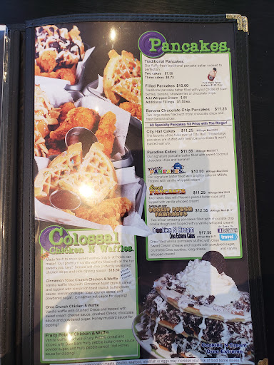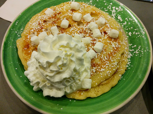 The food was okay it seems their claim to fame is putting candy in their food. Im not huge on sweets and just got a waffle with a side of sausage. The sausage seemed like it was just frozen sausage links that were very dry. The waffle was not bad but it did not stand out in anyway it was just like ever other waffle. Girlfriend had Reeses peanut butter cup pancakes. She enjoyed them and said they where very good. She also had a side of home fries, they had good flavor but are sliced potatos with skins on them. So if you dont mind potato skins then they are definitely worth trying. The service was not the best but the lady did a good job keeping water cups full. She just did not seem welcoming at all and might of just been having a bad day. I give it 3 stars because of the dried sausage, service being meh, and waffle being nothing to brag about.