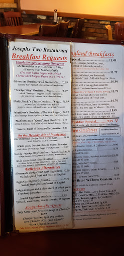 Pros: Great food, low prices, inventive specials Cons: Occasionally inconsistent service Were regulars to Josephs Two, and keep coming back because of the fantastic breakfast and lunch fare, combined with a very affordable price. The restaurant is homely inside, slightly cramped but still comfortable. Plenty of wood furnishings, the use of outdoor lighting indoors, and conservative decor make for a pleasant and relaxed environment. Parking in the front is tough, as there are only about 8 spots. But across the street is a free parking lot behind the Wendys and its never full, so as long as you dont mind waiting for the crosswalk you wont have trouble finding a spot. Dont try and park in McDonalds lot and go to Josephs! The jerks from the Golden Arches will have your car towed, even though their lot is never full. Restrooms are located behind the kitchen, and are maintained well enough to not be scary. There are some occasional hiccups in service, but normally we have a wonderful experience there. Frankly, it all depends on who your server is. Nearly all the complaints Ive heard about the service are all centered around one individual. We had that person actually become visibly upset at us when we said we had a party of 8 once, but then another time that same server recognized us and was friendly. Its true theyre not big fans of credit cards, but only if you try and use more than 2 of them for one table. Theyre a small business, not a chain, and part of how theyre going to keep costs down is by encouraging the use of cash. Since the bill is always small, this is not a problem anyway. However, I wish they would simply say "cash only" and skip the animosity towards people who try and use certain payment methods. Now on to the awesome: For a breakfast-centric restaurant, the food is exemplary. The portions are very generous, and the ingredients quality has never disappointed. Be sure to check the whiteboards for daily specials, because theyre usually worth checking out. Items like "The Berkshire Breakfast" (french toast with apple crisp topped over it with standard breakfast side options) make for mouth-watering Sunday treats, while "The Hungryman Breakfast" will top off even the most starving patron with a massive dose of excellent food, at a price that will surprise you with how low it is. As regulars, weve seen the occasional "batter-y" pancake or slightly over-crispy bacon, but those are very rare occurrences. Generally the cooking is top-notch and will not disappoint. I highly recommend the restaurant for an awesome local breakfast experience, and you can avoid the "Breakfast Nazis" (as the reviewer C.S. describes) just by using cash, and not trying to fit a huge party (8+) in during the rush times. Were regulars there for good reason!