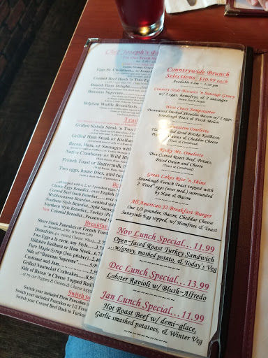 This is _not_ a gourmet restaurant. This is American comfort food. If you go in knowing that, youll be just fine and will actually enjoy this place. My family came here after some trendy restaurant we wanted to try ended up having a long wait. No wait at Josephs. In fact, it was completely empty for dinner. Im vegetarian, but two people in our party had the prime rib and said it was a bit tough. Apparently, the potatoes are good, though. Definitely the bread is great! Its warm. Its soft and crunchy... not spongey, not too hard to chew through (the crust just crumbles in your mouth). They also serve breakfast any time. I had the toasted ravioli and two eggs (scrambled) with French fries instead of home fries. My meal was great! Tasty and fattening.