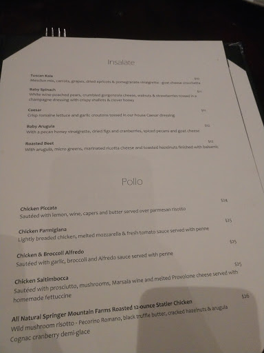 The food was excellent, the ambiance was casual and intimate, the food was tasty, and the service was better than all the former combined. The wine is a tad over priced, and the steak while cooked to perfection, lacked that wow factor. All of the pasta dishes were seasoned and cooked with care and precision, and provided the highlights of the meal. The antipasto was sufficient, but I say you start with the baked blue point oysters, original and creatively seasoned. We were there for a birthday, and the restaurant provided a 10" cake with some candles for a nominal charge. The cake was unexpectedly light, sweet, and delicious, but we didnt try any of the menu desserts. I cant compliment the service enough. It is always refreshing (and rare) to be served by true professionals. I would definitely recommend.