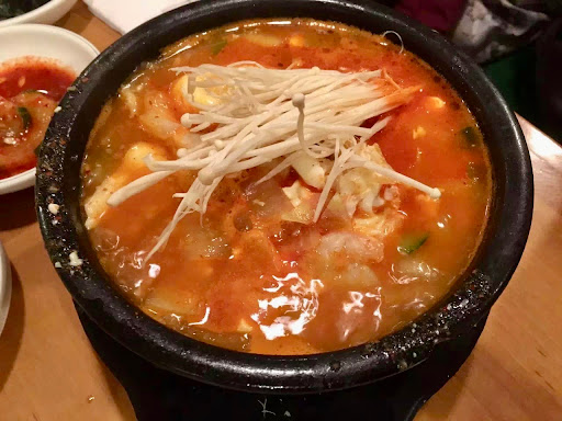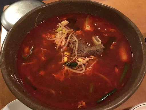 The menu here was big. It also contained many things that the squeamish westerner (me) would shy away from. I dont know if that is why I was the only non-asian in the place. To be fair, it was before dinner hour and therefore wasnt crowded (maybe a dozen by the time I left at 4:30), so I dont know if that is the norm, but the wall contained maybe two dozen items displayed on it in Korean, some of which offered no English translations. I suspect that if you are Korean or adventurous you would likely find things here you wish were more available, or made the way you would like them.. I dont know for certain though. I have no Korean roots and nearly always get dol sot bi bim bap, so I dont exactly have broad knowledge. And I live in Pittsburgh so I have no local frame of reference. When my food was served there was one other couple in the restaurant (again, 4 PM). My server brought a tray of banchan that I assumed was part mine and part for the other couple. I was surprised when she laid 10 dishes on me, and a miso soup. I am used to 3 or 4. Each one was fresh and tasty (spicy). Come to think of it, the couple got the same 10 dishes. Maybe they dont adjust for the number of people. The DSBBB here has a light flavor compared to that of Pittsburgh restaurants. It also didnt scorch my tongue the way it sometimes does (maybe it had time to cool while I ate all that banchan). The vegetables were clearly fresh because they had a bit of that raw crunch that I like. It was nice overall. And it was only $10. Its $18 in Pittsburgh.