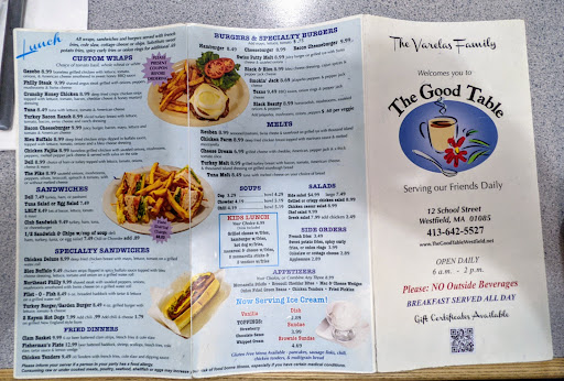 This place is amazing!!! A group of us were going to be in Westfield and wanted to eat at a non-chain local place. I Google searched and found that The Good Table had great reviews so we decided to check it out! Its located down a side street, in an older building with character and your welcomed with a big smile! They have a great, affordable menu and the food comes out fast and hot!