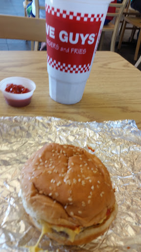I love eating at Five Guys. It is pretty much a small cheeseburger, small fry and regular drink. They give more than enough to fill you up. Good tasting food.