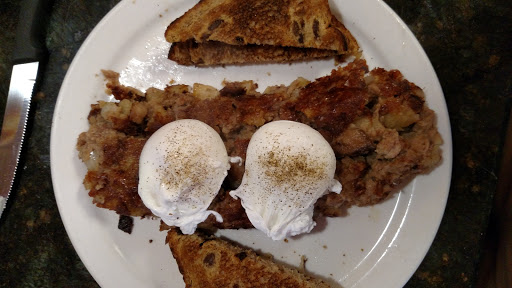 The wait staff is super friendly and the food is AMAZING! They make their own homemade corned beef hash which was delicious and they have interesting specials. I ordered the Mad Hatters Delight which was 3 eggs over a hash filled pastry smothered in a special sauce served with a side of home fries and it was the best hash breakfast Ive ever had.