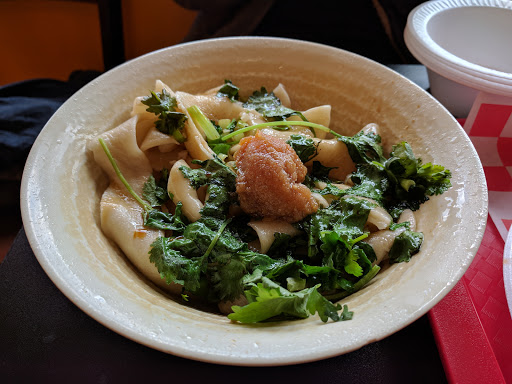 Went here and got hand pulled noodles and the girl got house broth and noodles. Think the noodles and broth had a nice vinegary/alkaline taste to them. I think they put mixed veggie packet in there too? Not a fan of peas.The hand pulled noodles were coated in hot oil which was nice. More things on the menu looked quite good too. I will have to explore it later. Does not accept credit cards at the moment.