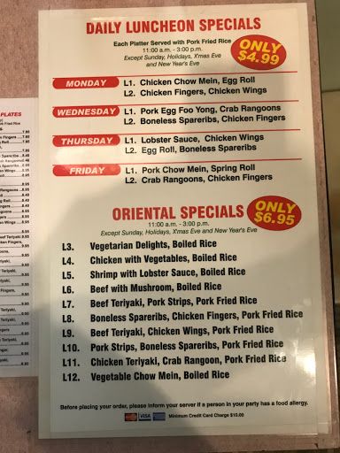 -$2.99 daily lunch specials: 2 options (always one of them is appealing to me). -$4.99 everyday specials: 10 options, and having tried most of them theyre all delicious -I always order dinner from them too, while the price is slightly more, the quality is even better, not that there is anything wrong with the lunch specials quality -Open kitchen, so you can actually see the food being prepared. -The cashier has always been friendly the numerous times Ive stopped in for lunch -Speedy service -Stop complaining about credit card/debit card minimums, everyone... CASH IS KING!