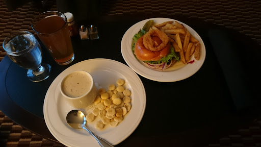 This Bar/Resturant is inside the Crown Plaza Hotel. We ate here tonight because we were too tired to go anywhere else. Its a nice sports bar. The food was good but not great. The service was good but not great. The server was friendly. My son and wife enjoyed the French Onion Soup, while I enjoyed the Boston Chili and Dry Rub Chicken Wings. Again, nothing bad, but not great. Apparently its going to be crowded tonight (Friday) because there will be a live band, but while we were there from 7-8 on a Friday, it was not crowded.