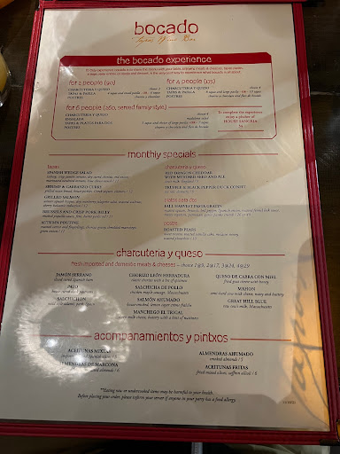 We have had dinner at Bocado several times in the last two months and have always had a great experience. The tapas menu is great-- it is one of the few restaurants that has so many delicious options that we cannot even try them all in one visit! Our server (John) was fantastic, professional, friendly, knowledgeable and helpful. He usually works at the Providence location, but we are glad that he has been in Worcester the last couple of times weve visited. The extensive selection of wines is excellent and its nice to have so many choices by the glass as well as by the bottle. Spanish and Portuguese wines are very good values that many restaurants do not offer, so we are always happy to try the different varieties at Bocado. We highly recommend Bocado (both in Worcester and Wellesley).